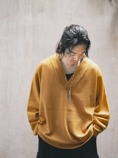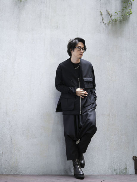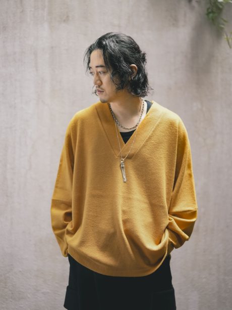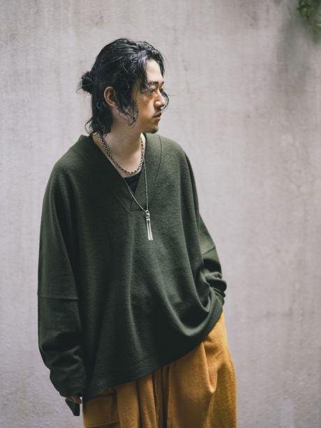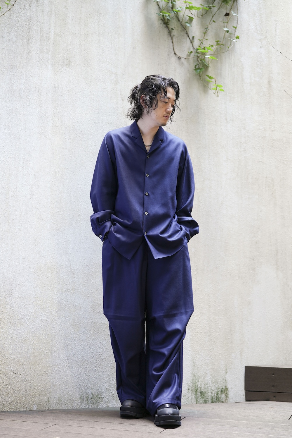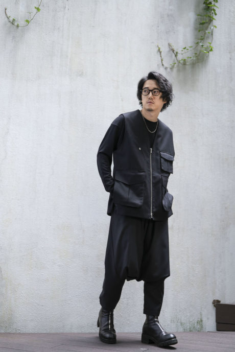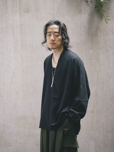 特殊なウールナイロン素材を使い、モード感のあるブークレ素材を作りました。縮絨の様なモードな匂いのするアイテム。スーパーワイドのカーゴパンツとキモノの様な印象の深Vネックのデザインとなっています。