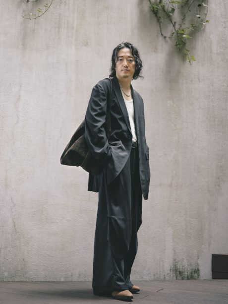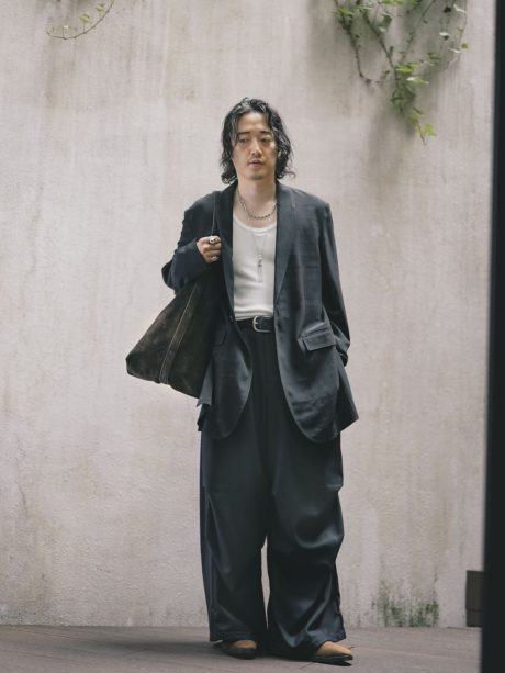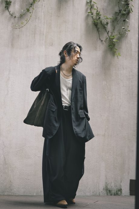 シワにならないトリアセテート素材を使ったジャパニーズモードを感じさせるセットアップ。もちろん単品使いもOKです。
