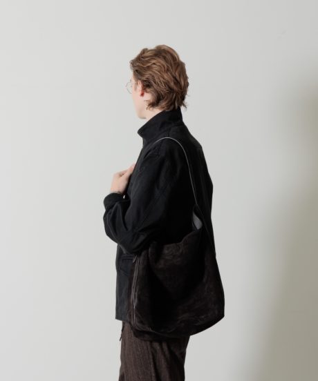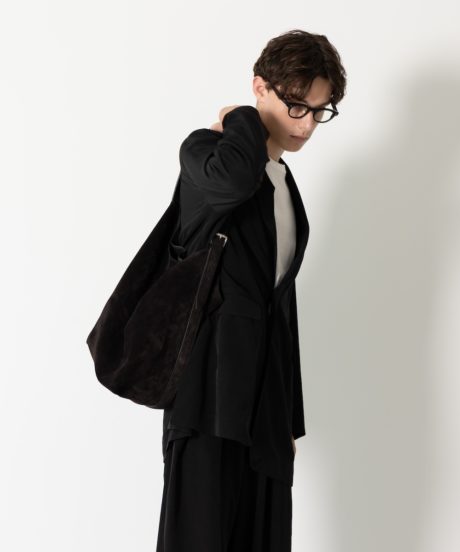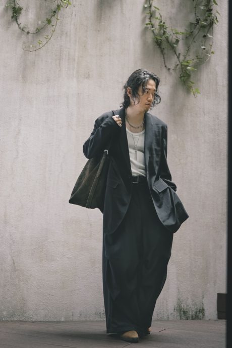 ヨウジヤマモトやレインメーカーなどジャパニーズラグジュアリーなブランドたちが好んで使うこの素材。シワになりにくくドレープ感も強い。高級感がありながら手間がかからずイージーな素材なのでこうした生地量が多くシワが入りそうなサルエルシルエットなどでも気にせず楽しむことができます。