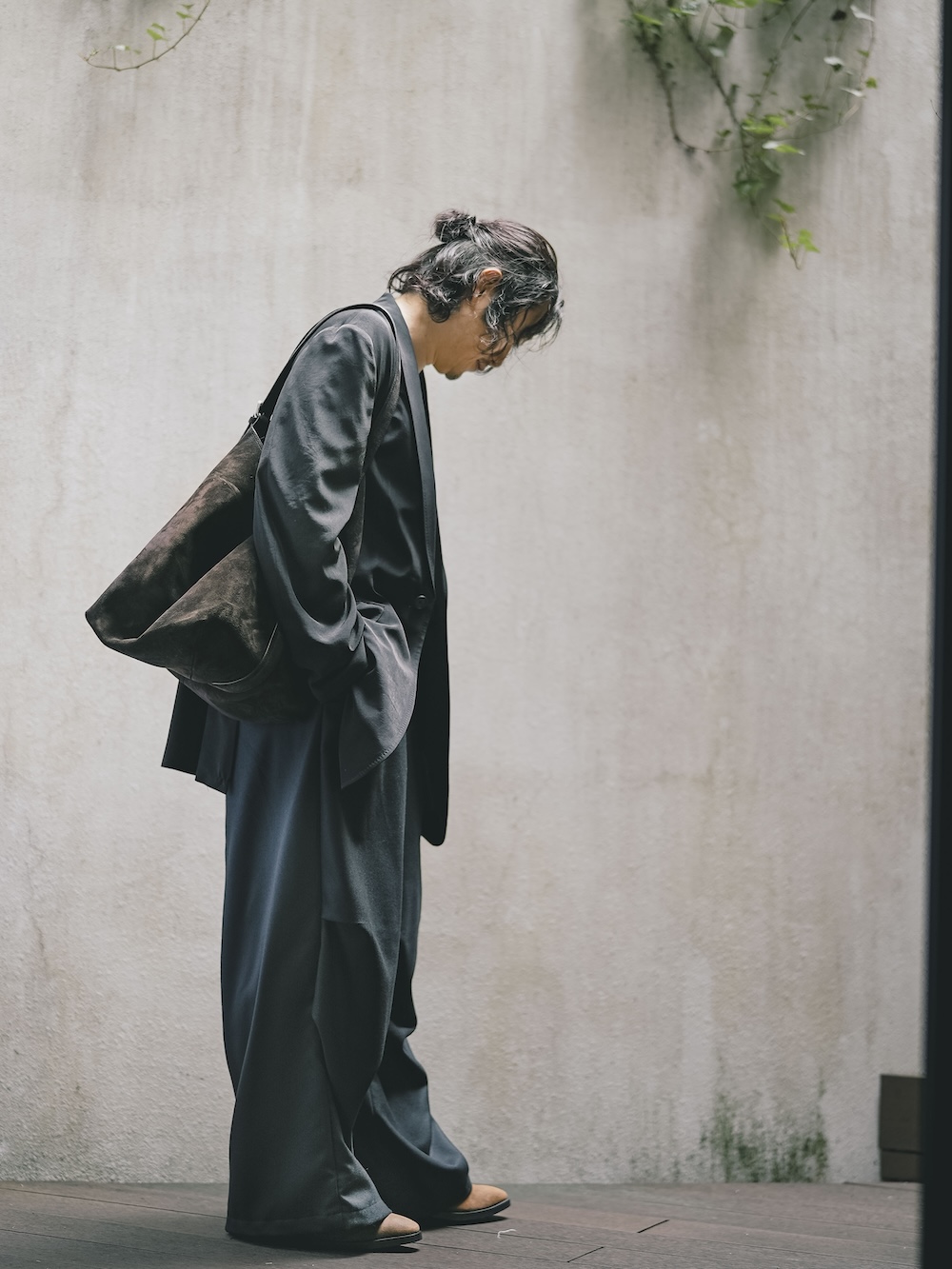 ヨウジヤマモトやレインメーカーなどジャパニーズラグジュアリーなブランドたちが好んで使うこの素材。シワになりにくくドレープ感も強い。高級感がありながら手間がかからずイージーな素材なのでこうした生地量が多くシワが入りそうなサルエルシルエットなどでも気にせず楽しむことができます。