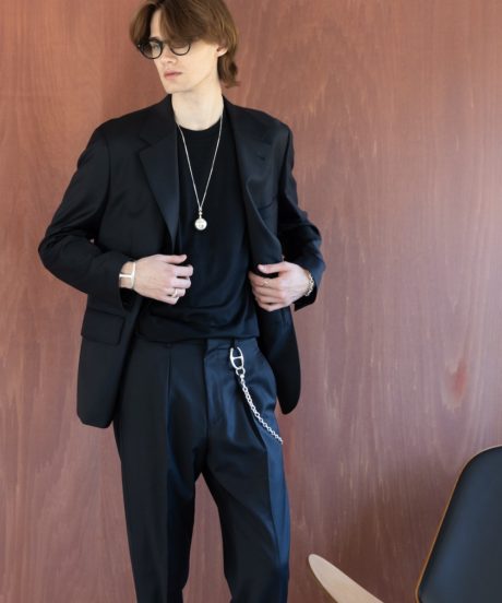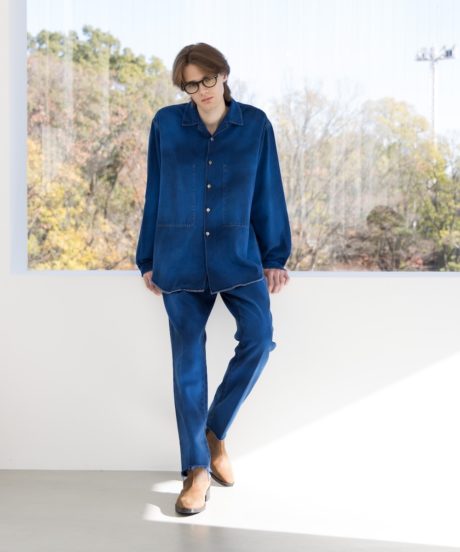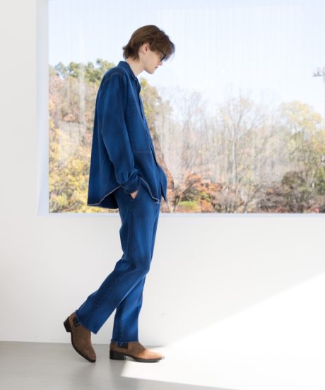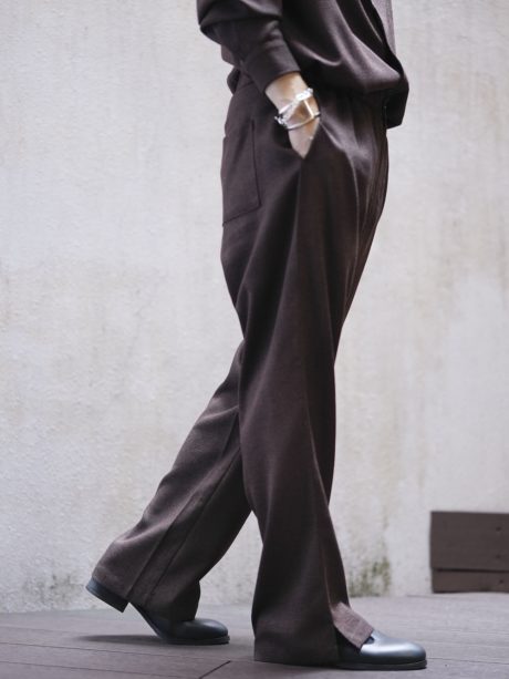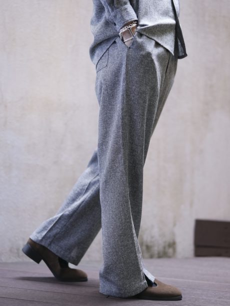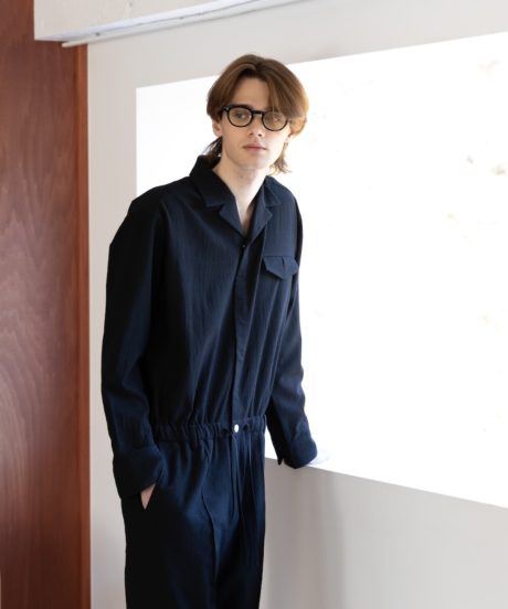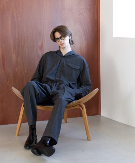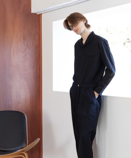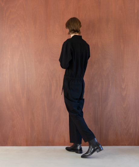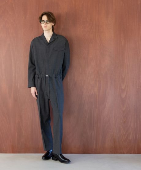 MBアイテムのスペシャリテ素材である尾州ウール近江晒素材を使ったジャンプスーツを制作。ジャケットなどに使った尾州近江の素材とは異なり、やや薄手に仕上げオールシーズン対応のものとしました。