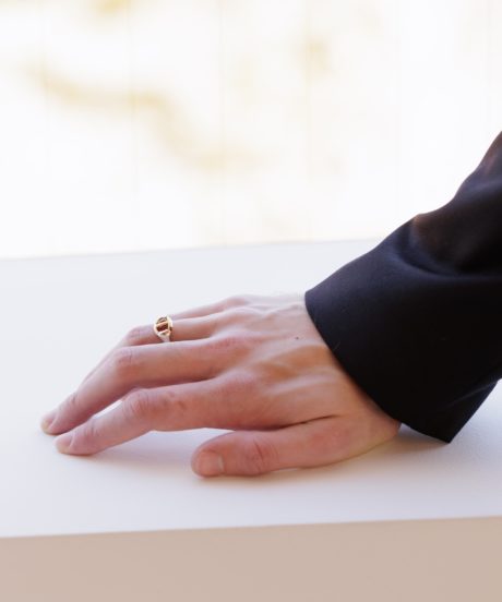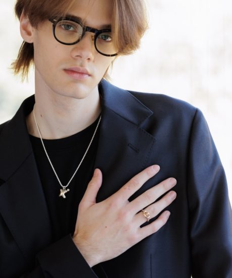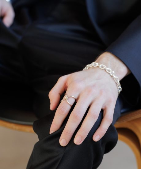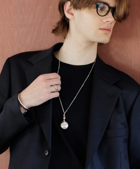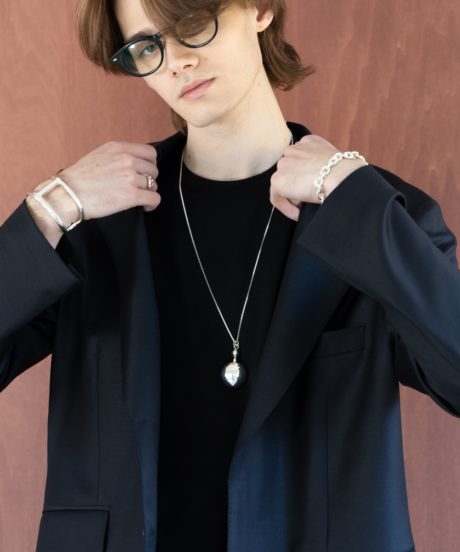 ブランドアイコンである「曲線」で、イニシャルである「O」と「X」を使ってネックレスとリングを作成。MB所有のアンティーク品をモチーフにしており、アンティークのアトマイザー(香水入れ)を参考に制作しました。実際にアトマイザーとしても使えます(多分使わないと思いますが)。