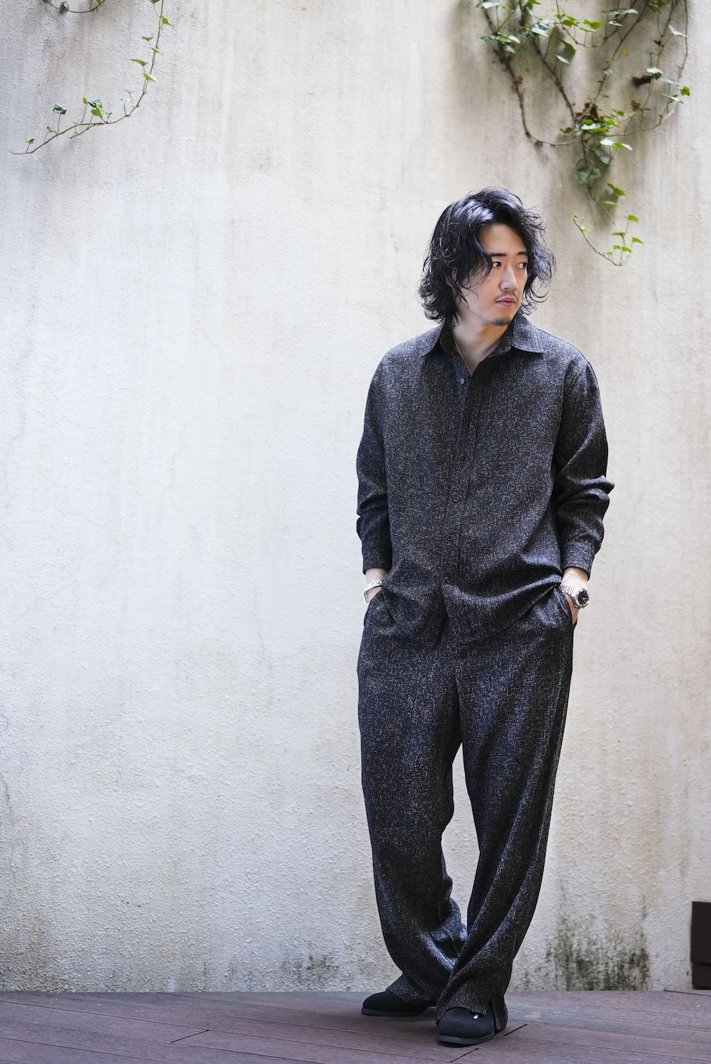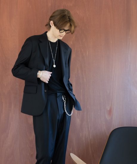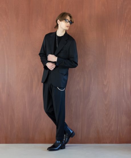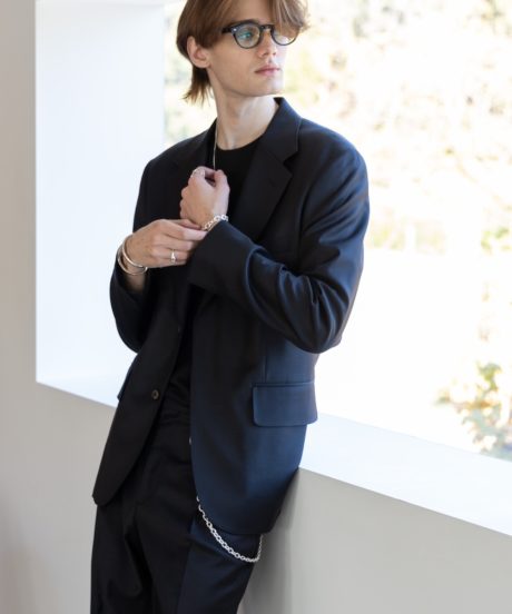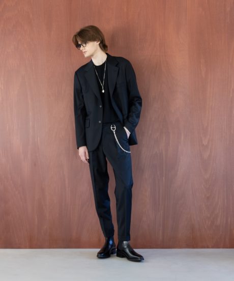 MBアイテムのスペシャリテ素材である尾州ウール近江晒素材を使ったジャンプスーツを制作。ジャケットなどに使った尾州近江の素材とは異なり、やや薄手に仕上げオールシーズン対応のものとしました。