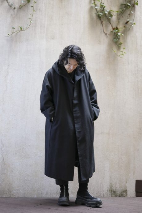どこかヨウジヤマモトのコレクションに見られるような、モードなニュアンスを感じさせる佇まいに仕上げています。