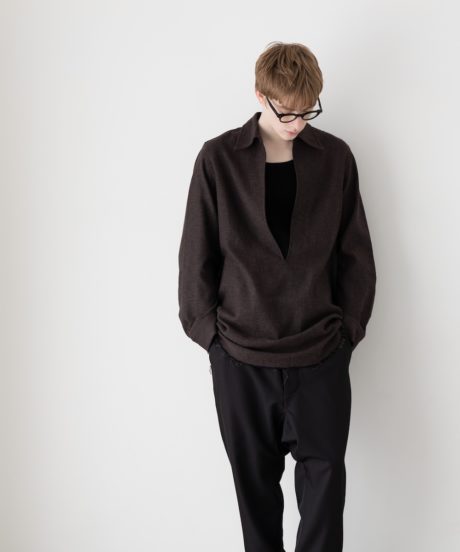 リネンタッチの風合いですがやや厚手になっておりオールシーズン使える。着丈が長くアウターとしても機能する上、インナーとしても活用できる。荒々しくカットオフに見せた裾や袖と上品なヴァルーズの雰囲気が絶妙にマッチした力作。