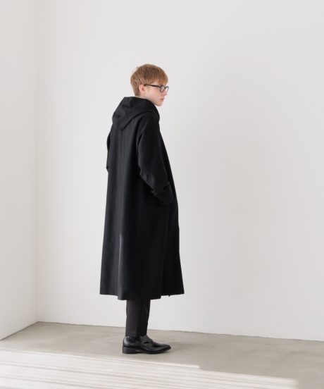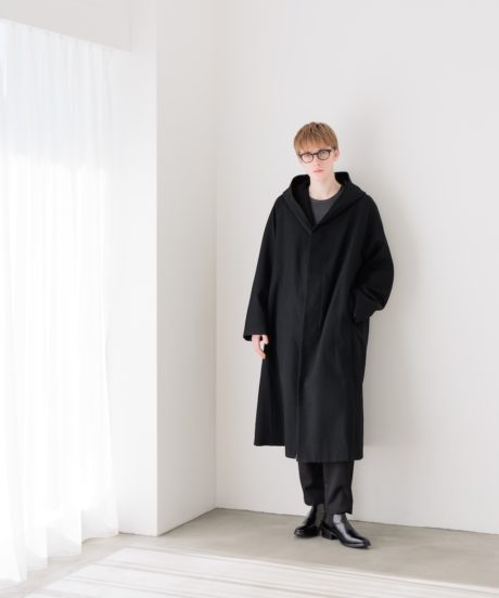 一般的にフードが独立したコートとは異なり、ショールカラーとフードが一体化したような雰囲気のあるデザインです。