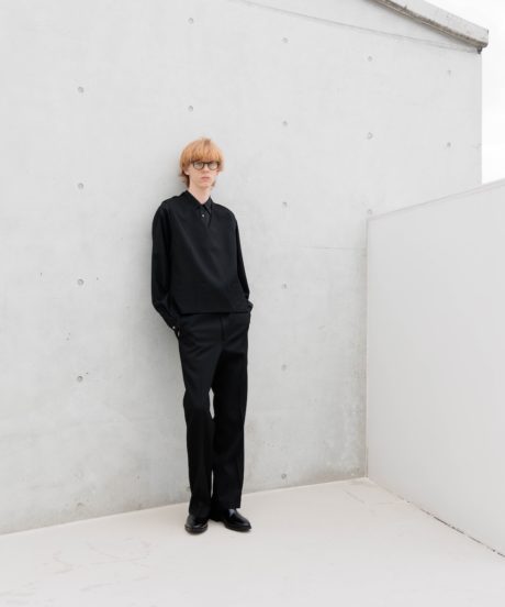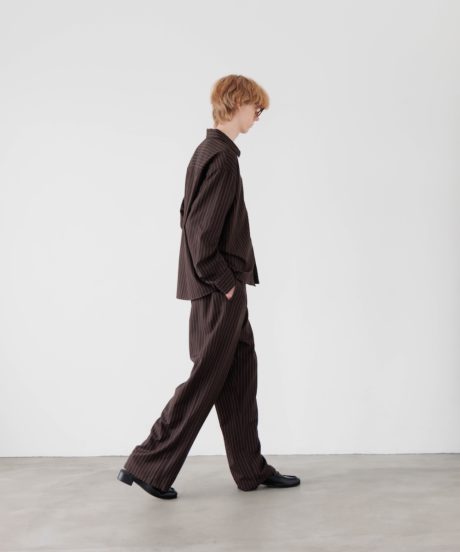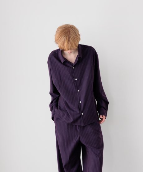 またシャツはラウンドカットではなくボックスカット。通常ルームウェアやパジャマはボックスカットが多くなります。裾のラウンドなどがあると寝ている時に邪魔なので四角形に近い形でパターンを引くことが多いのです。今回素材の光沢感やストライプの柄遣いなどでしっかりフォーマルにできているのでシルエットそのものはパジャマに寄せています。