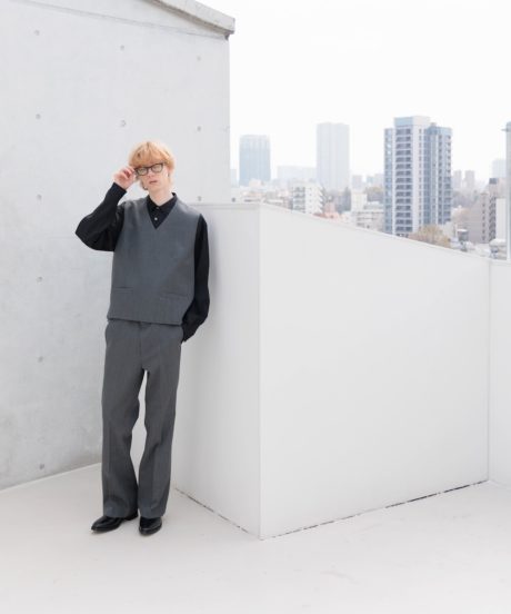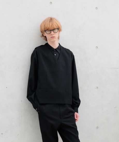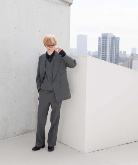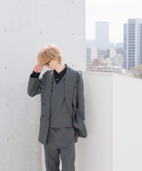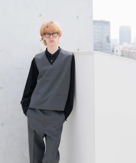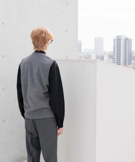 またジレはかなりデザインに迷ったのですが、あえてディティールを全て外したミニマル仕様にしてみました。本来あるべきはずのボタンやステッチングを入れずに、プルオーバーのシンプルなデザインに仕上げています。こうすることでフォーマルから少し距離のある素材の美しさが目立つジレが完成。ただしボタンを外すことでストレッチ性のないジレが着にくくなりますので、背面はニットにして着用の快適さも担保しました。