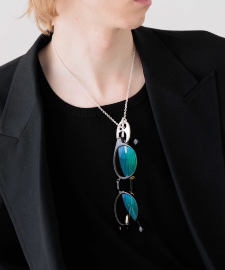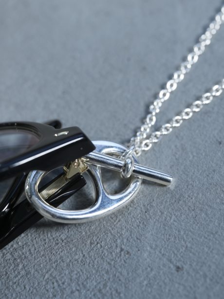 アンカーチェーンの構造上、自然に空間が生まれるので、そこに眼鏡を引っ掛けるだけで成立する。