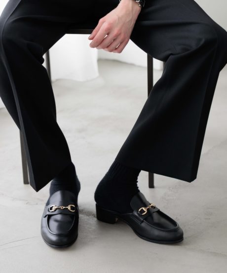 ミュールにしては少々珍しくヒールを高めに設計しておりスラリとした脚長シルエットが見せれるようにしています。レザーアッパー、レザーソールの高級仕様。素材的にもシーズン問わず使える様にしていますので、春から冬まで愛用できます。昨今のローファートレンドで「普通のローファー」は出尽くしてる感がありますから、オシャレ感を意識してビットデザインに。