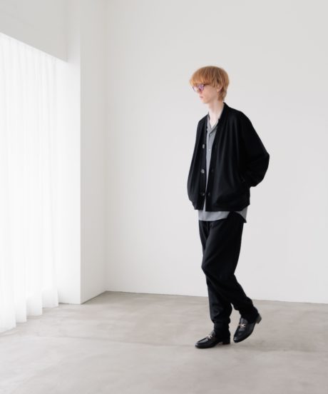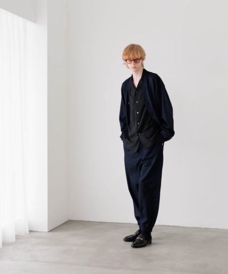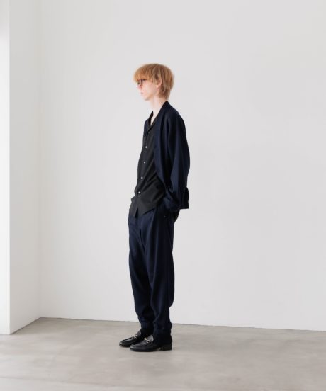 ボトムスであるトラウザーもゆったりとしたウエストをドローコードで絞って着用するタイプに。ゆったりとしたシルエットですがワイドまではいかないバランスの取れたシルエットです。