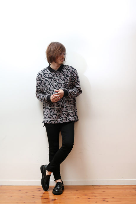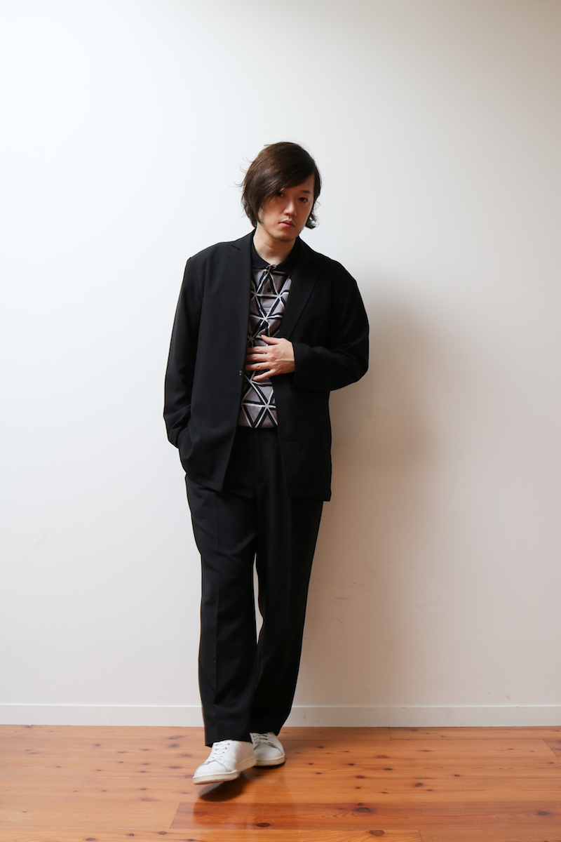 何より上下黒「いつも通り」のコーディネートの中に入れるだけで一気に「コレクションブランド」の雰囲気が出せます。複雑な模様と高級感ある素材、そして品のあるポロシャツデザインで一気に上下黒の着こなしが映えるでしょう。こちらのコーディネート上はGUのもの、決して高価なものじゃありません。それでもこの雰囲気が出せる。長いシーズン使えるインナーウェアとしてもおすすめです。