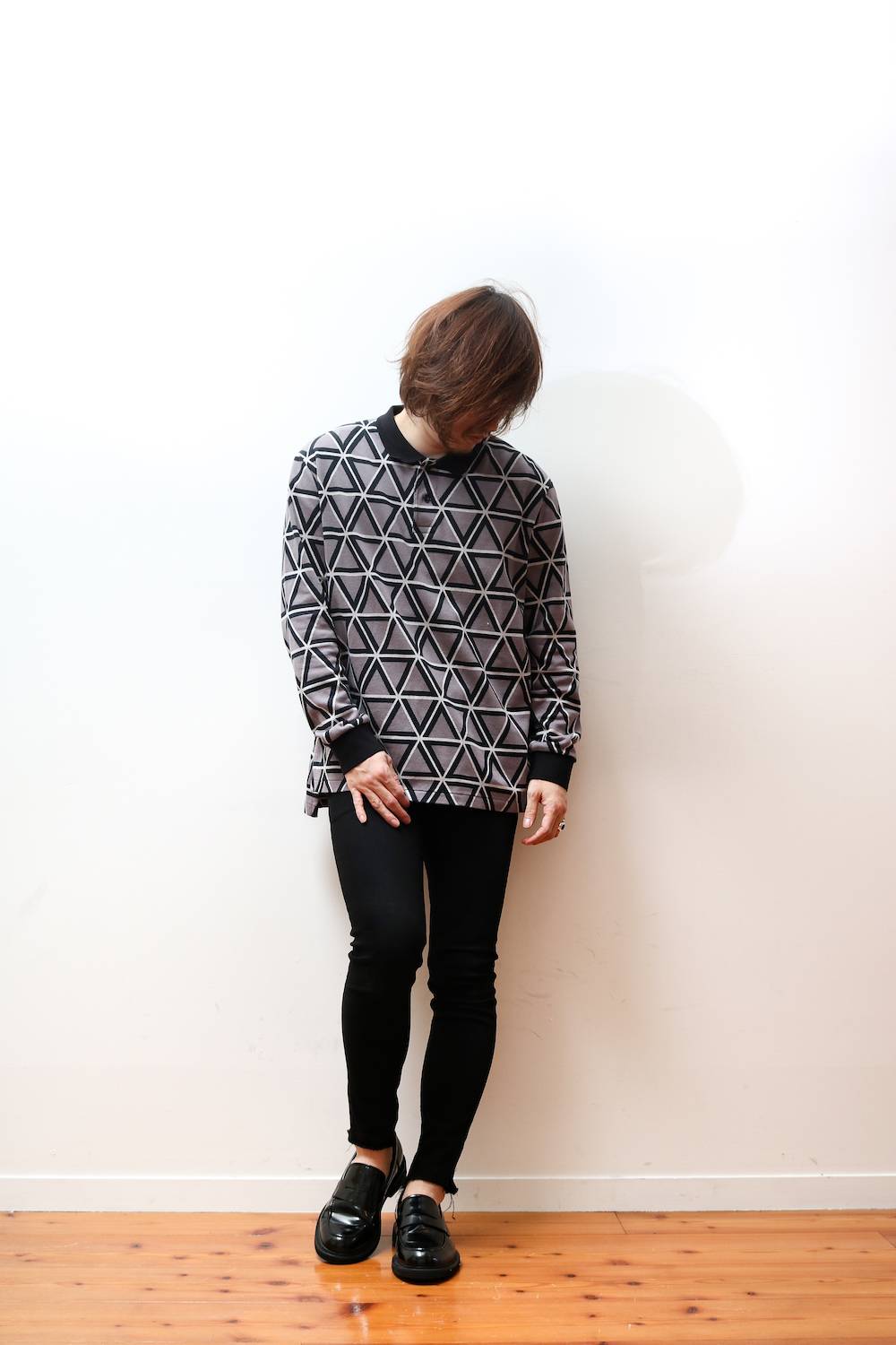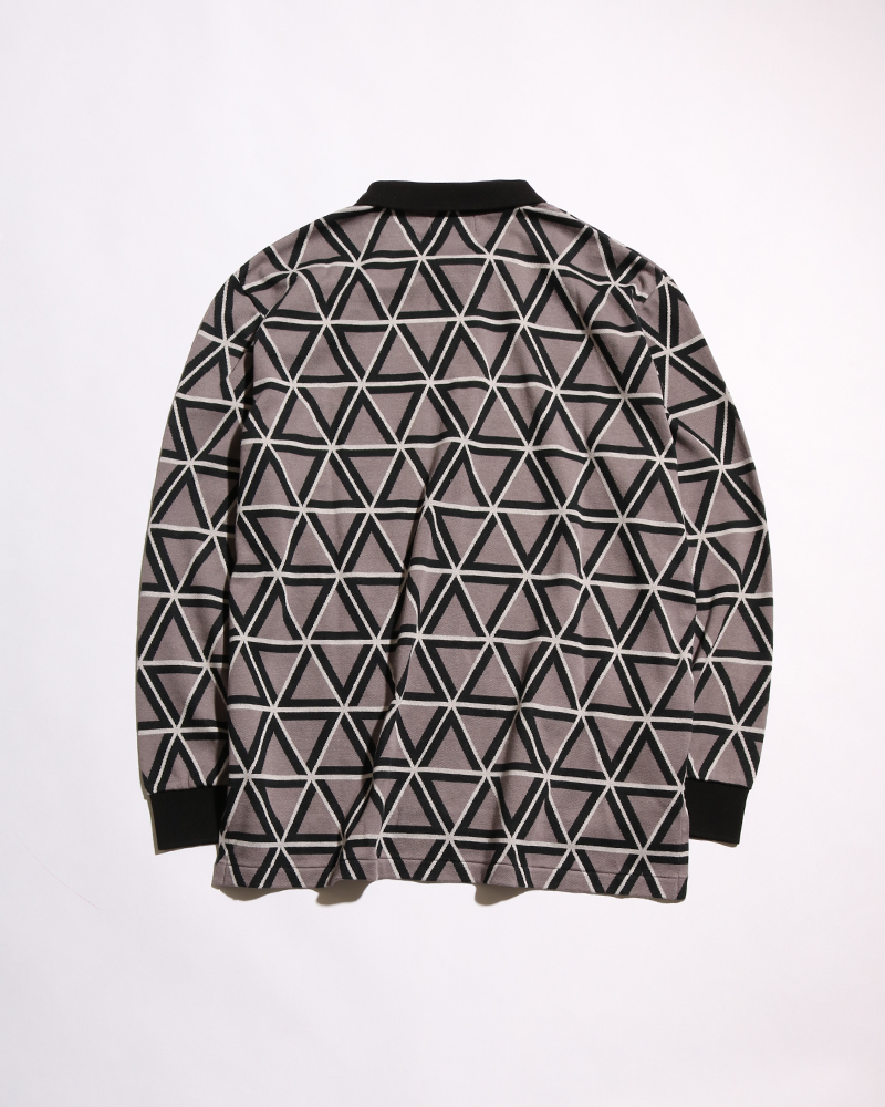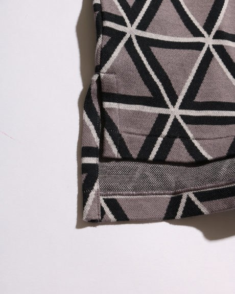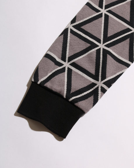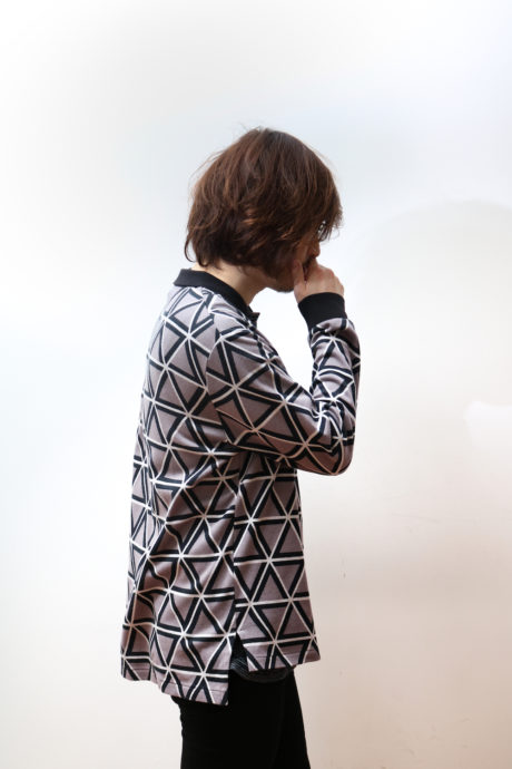 ATSUSHI NAKASHIMAのアイコンともいえる幾何学的なパターンをジャカードニットで表現。オリジナルで生地を制作しました。プリントなどではなく織りで表現しているため高級感と立体的な表情があり、1枚でも十分映えるアイテムとなっています。